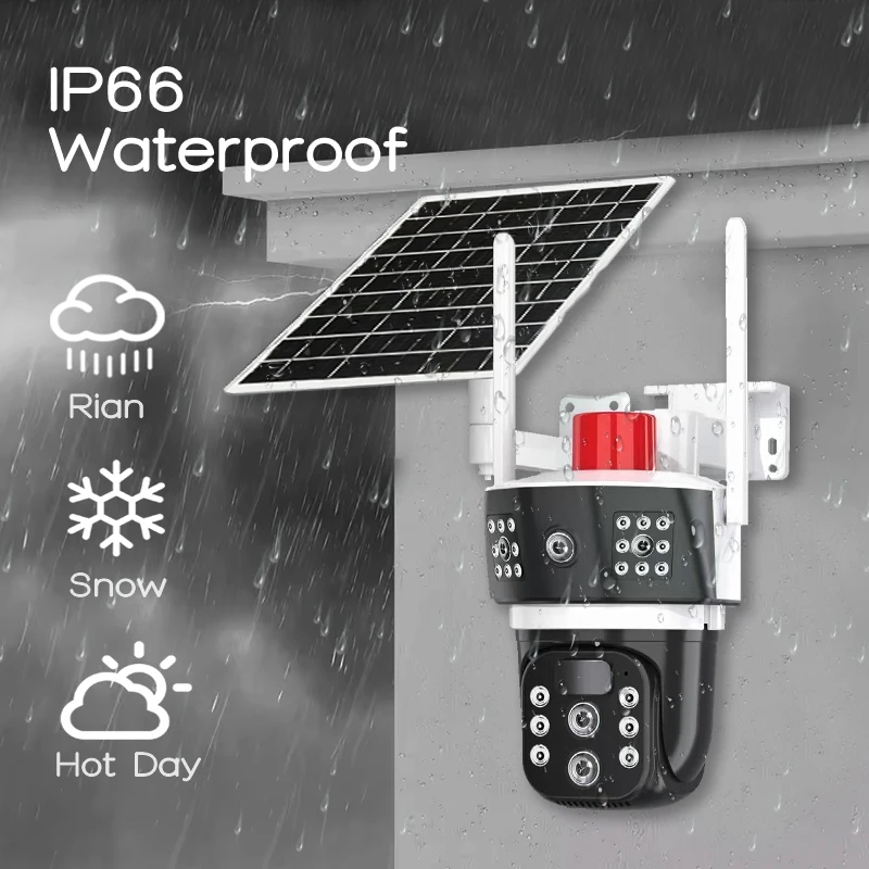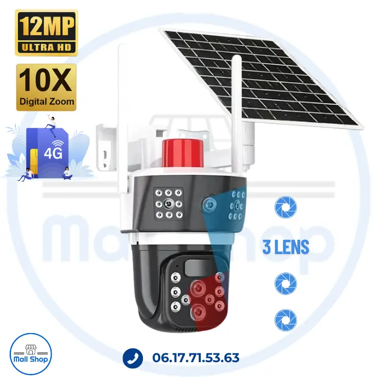 كاميرا مراقبة بالطاقة الشمسية 6K ثلاثية العدسة بدقة 12 ميجابكسل 4G Zoom Optique X10