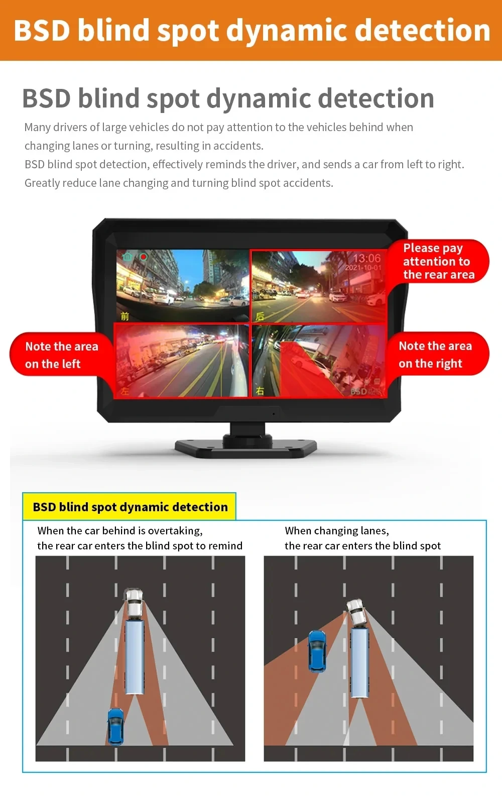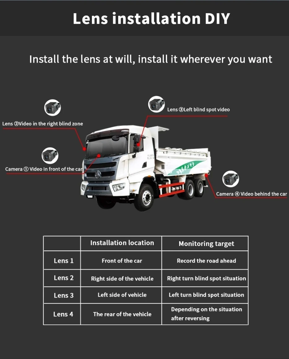 الكاميرا معمولة خصوصي للشاحنات و الكاميوات. بشاشة كبيرة 10 بوصة كتوريك الطريق و الجوانب بوضوح كبير، و كتوفر ليك مراقبة كاملة فالليل و فالنهار
